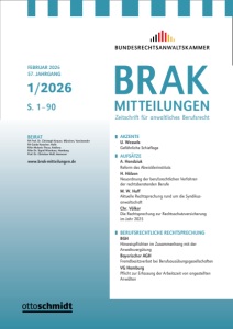BRAK MITTEILUNGEN Zeitschrift für anwaltliches Berufsrecht BEIRAT FEBRUAR 2026 57. JAHRGANG 1/2026 S. 1–90 AKZENTE U.Wessels Gefährliche Schieflage AUFSÄTZE A. Handziuk Reform des Abwicklerinstituts H. Hölzen Neuordnung der berufsrechtlichen Verfahren der rechtsberatenden Berufe M.W. Huff Aktuelle Rechtsprechung rund um die Syndikusanwaltschaft Chr. Völker Die Rechtsprechung zur Rechtsschutzversicherung im Jahr 2025 BERUFSRECHTLICHE RECHTSPRECHUNG BGH Hinweispflichten im Zusammenhang mit der Anwaltsvergütung Bayerischer AGH Fremdbesitzverbot bei Berufsausübungsgesellschaften VGHamburg Pflicht zur Erfassung der Arbeitszeit von angestellten Anwälten