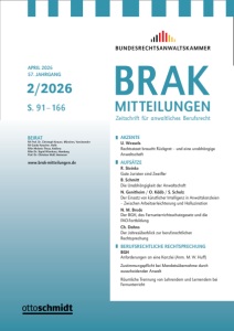 päischen Parlaments und des Rates, wie durch Art. 24 III der Verordnung (EU) 2023/2844 des Europäischen Parlaments und des Rates für die elektronische Zustellung von Schriftstücken über den europäischen elektronischen Zugangspunkt eingeführt ABl. der Europäischen Union L v. 16.1.2026 Berichtigung der Verordnung (EU) 2024/1347 des Europäischen Parlaments und des Rates v. 14.5.2024 über Normen für die Anerkennung von Drittstaatsangehörigen oder Staatenlosen als Personen, denen internationaler Schutz gewährt wurde, für einen einheitlichen Status für Flüchtlinge oder für Personen mit Anspruch auf subsidiären Schutz und für den Inhalt des gewährten Schutzes, zur Änderung der Richtlinie 2003/109/EG des Rates und zur Aufhebung der Richtlinie 2011/95/EU des Europäischen Parlaments und des Rates (ABl. L, 2024/1347, 22.5.2024) ABl. der Europäischen Union L v. 13.1.2026 Berichtigung der Richtlinie (EU) 2024/1499 des Rates v. 7.5.2024 über Standards für Gleichbehandlungsstellen im Bereich der Gleichbehandlung von Personen ungeachtet ihrer Rasse oder ethnischen Herkunft, der Gleichbehandlung von Personen in Beschäftigung und Beruf ungeachtet ihrer Religion oder Weltanschauung, einer Behinderung, ihres Alters oder ihrer sexuellen Ausrichtung sowie von Frauen und Männern im Bereich der sozialen Sicherheit und im Bereich des Zugangs zu und der Versorgung mit Gütern und Dienstleistungen und zur Änderung der Richtlinien 2000/43/EG und 2004/113/EG (ABl. L, 2024/1499, 29.5.2024) ABl. der Europäischen Union L v. 9.1.2026 Berichtigung der Richtlinie (EU) 2024/1500 des Europäischen Parlaments und des Rates v. 14.5.2024 über Standards für Gleichbehandlungsstellen im Bereich der Gleichbehandlung und Chancengleichheit von Frauen und Männern in Arbeits- und Beschäftigungsfragen und zur Änderung der Richtlinien 2006/54/EG und 2010/41/ EU (ABl. L, 2024/1500, 29.5.2024) ABl. der Europäischen Union L v. 9.1.2026 AUS DEN ZEITSCHRIFTEN Nachfolgend dokumentiert das Institut für Prozess- und Anwaltsrecht an der Leibniz Universität Hannover neu erschienene Literatur zum Berufsrecht der Rechtsanwälte, Notare und Steuerberater, die in den zurückliegenden Wochen veröffentlicht worden ist. Aus Platzgründen wird auf Veröffentlichungen in BRAK-Mitt. und AnwBl., die Standardlektüre aller anwaltsrechtlich Interessierten sind, verzichtet; zudem muss eine wertende Auswahl getroffen werden. Zusammengestellt vom Institut für Prozess- und Anwaltsrecht der Leibniz Universität Hannover von Dipl.- Jur. Enis Robert Dibrani und Dipl.-Jur. Hannah Hölzen. Anwaltliche Grundpflichten Holzmann, Der Schutz anwaltlicher Verschwiegenheit aus strafprozessualer Perspektive, ÖAnwBl 2026, 79 Anwaltliche Honorierung Burhoff, Angelegenheiten in Straf- und Bußgeldsachen – Teil 2: Verschiedene und besondere Angelegenheiten (§§ 17, 18 RVG), AGS 2026, 49 Schneider, KostBRÄG 2025 und Übergangsfälle zum RVG: Von der Streitverkündung bis zur Zwei-Kalenderjahres-Frist, ZAP 2026, 132 Berufsausübungsgesellschaften Fellner, Ausscheiden des alleinigen Sachbearbeiters aus Anwaltssozietät: Was passiert mit dem Mandat, MDR 2026, 280 Gilgan, Berufsrechtliche Compliance: Wie sollten Berufsausübungsgesellschaften mit den Compliance-Anforderungen umgehen?, KP 2026, 51 Posegga, Rechtsberatungsbefugnis von anwaltlichen Berufsausübungsgesellschaften ohne berufsrechtliche Zulassung, ZPG 2026, 11 Kanzleiorganisation Cramer-Scharnagl, Schwierige Mandanten Teil 5: Der Aggressive: Deeskalationsstrategien für hitzige Mandanten, AK 2026, 35 Ecker, Kanzleientwicklung: Der demografische Wandel ist eine riesige Chance für moderne Kanzleien, KP 2026, 26 Legal Tech, Künstliche Intelligenz und Digitalisierung Gaa, Prompting und KI-Einsatz in der Kanzlei: Anwaltliche Kontrolle, Nachvollziehbarkeit und Qualitätssicherung, ZAP 2026, 107 Schneider, Künstliche Intelligenz: KI kann den Berater nicht ersetzen, KP 2026, 46 Teichmann, Cybersecurity-Governance und berufliche Sorgfalt: Sicherheitsstandards für Kanzleien, Anwaltsrevue 2026, 22 Syndikusrecht Huff, Der Syndikusrechtsanwalt als Arbeitnehmer und seine Weisungsfreiheit, DB 6/2026, M4 Reformbestrebung zum anwaltlichen Berufsrecht Deckenbrock, Die Entwicklung des anwaltlichen Berufsrechts, NJW 2025, 3688 Markworth, Rechtsdienstleistungen durch Rechtsschutzversicherer, NJW-Spezial 2026, 481 Markworth, Indirekte Prozessfinanzierungsregulierung – Warum Deutschland kein eigenständiges Regelungsregime für Prozesskostenfinanzierer braucht, ZfPW 2025, 411 Römermann, BRAO-Reformen 1994 – 2022 – 2025, GmbHR 2026, R36 Notare und Steuerberater Gehrlein, Die Rechtsprechung des BGH zur Beraterhaftung in den Jahren 2024 bis 2025, DStR 2026, 240 Weyand, Berufszulassung: Wiederzulassung als Steuerberater und Pflichtverteidigerbestellung, KP 2026, 36 AUS DEN ZEITSCHRIFTEN BRAK-MITTEILUNGEN 2/2026 AKTUELLE HINWEISE VI